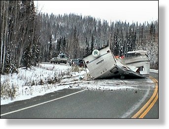 Ein ziemlich großes Motorhome ist in einer Kurve ins Schleudern gekommen