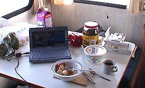Auf der Fahrt sehr nützlich ist ein 12V zu 220V Konverter (von