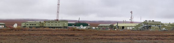 Nach weiteren 44 Meilen durch das arktische Flachland auf angenehm ausgebauter Strasse kamen die Ölförderanlagen in Sichtweite. Ausserdem grosses Gerät und Baracken (hier sagt man dazu Trailerhomes oder Hotels...). Die Grafik zeigt unverkennbar den Ortsnamen: Deadhorse.