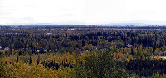 Bevor ich Fairbanks in Richtung Steese Highway verlasse, wollte ich noch den 'Mulholland Drive' von Fairbanks aufsuchen. Hier hat man einen schönen Blick auf die Stadt, bei klarer Sicht bis zum Mt. McKinley. Auch sieht man, das Fairbanks inmitten eines grossen Waldgebietes liegt. Am Abend liegt dann das glitzernde Fairbanks vor einem, dazu hat man hier extra viele Parkplätze vorgesehen, damit man es aus dem Auto heraus geniessen kann...