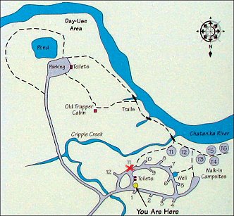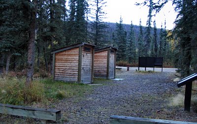 Bei Mile 60 liegt der Cripple Creek Campground. Ausser mir waren nur noch zwei weitere Camper hier, es dunkelte jedoch und somit gab es keinen Kontakt. Der Cripple Creek ist ein kleiner Bach, der durch den Campground fliesst. Meinem Standplatz gegenüber waren die Toiletten, wie auf der Karte zu sehen ist.
